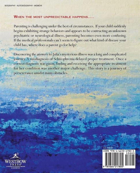 When the most unpredictable happens..... Parenting is challenging under the best of circumstances. If your child suddenly begins exhibiting strange behaviors and appears to be contracting an unknown psychiatric or neurological illness, parenting becomes even more confusing. If the medical professionals can't seem to figure out what kind of disease your child has, where does a parent go for help? Discovering the answers to Julia's mysterious illness was a long and complicated journey. A misdiagnosis of Schizophrenia delayed proper treatment. Once a correct diagnosis was given, finding and receiving the appropriate treatment for her condition was another major challenge. This story is a journey of perseverance amidst many obstacles.