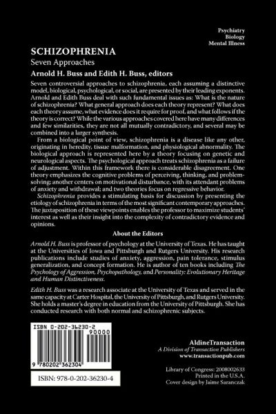 Seven controversial approaches to schizophrenia, each assuming a distinctive model, biological, psychological, or social, are presented by their leading exponents. Arnold and Edith Buss deal with such fundamental issues as: What is the nature of schizophrenia? What general approach does each theory represent? What does each theory assume, what evidence does it require for proof, and what follows if the theory is correct? While the various approaches covered here have many differences and few similarities, they are not all mutually contradictory, and several may be combined into a larger synthesis. From a biological point of view, schizophrenia is a disease like any other, originating in heredity, tissue malformation, and physiological abnormality. The biological approach is represented here by a theory focusing on genetic and neurological aspects. The psychological approach treats schizophrenia as a failure of adjustment. Within this framework there is considerable disagreement. One theory emphasizes the cognitive problems of perceiving, thinking, and problem-solving; another centers on motivational disturbance, with its attendant problems of anxiety and withdrawal; and two theories focus on regressive behavior. Schizophrenia provides a stimulating basis for discussion by presenting the etiology of schizophrenia in terms of the most significant contemporary approaches. The juxtaposition of these viewpoints enables the professor to maximize students' interest as well as their insight into the complexity of contradictory evidence and opinions.