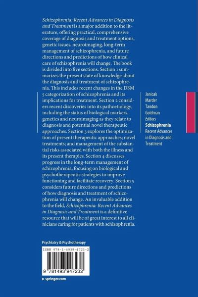 Section 1: History, epidemiology, clinical course, present diagnostic criteria and impact of schizophrenia on the individual and society.o Chapter 1. Introduction o Chapter 2. Evolving Nosology of Schizophrenia: Implications for Treatment Section 2: Recent and promising areas of research into the pathophysiology of schizophrenia with a focus on the implications for treatment of this disordero Chapter 3. Overview of Neurobiologyo Chapter 4. Pathophysiology of Schizophrenia o Chapter 5. Genetics o Chapter 6. Biological Markers o Chapter 7. Neuroimaging Section 3: Medical management of schizophreniao Chapter 8. Acute management of schizophrenia o Chapter 9. Long-term management of schizophreniao Chapter 10. Management of comorbidities associated with schizophrenia o Chapter 11. Management of water imbalance in schizophreniao Chapter 12. Management of medication-related adverse effects Section 4: Management of schizophrenia and its long-term complicationso Chapter 13. Psychotherapeutic and rehabilitation approaches o Chapter 14. Psychoeducation Section 5: Future directions in research and implications for developing more effective therapieso Chapter 15. Conclusion