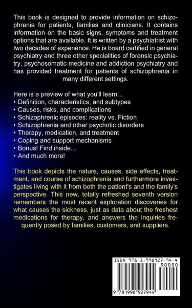 This book is designed to provide information on schizophrenia for patients, families and clinicians. It contains information on the basic signs, symptoms and treatment options that are available. It is written by a psychiatrist with two decades of experience. He is board certified in general psychiatry and three other specialities of forensic psychiatry, psychosomatic medicine and addiction psychiatry and has provided treatment for patients of schizophrenia in many different settings. Here is a preview of what you'll learn...Definition, characteristics, and subtypes Causes, risks, and complications Schizophrenic episodes: reality vs. Fiction Schizophrenia and other psychotic disorders Therapy, medication, and treatment Coping and support mechanisms Bonus! Find inside... And much more! This book depicts the nature, causes, side effects, treatment, and course of schizophrenia and furthermore investigates living with it from both the patient's and the family's perspective. This new, totally refreshed seventh version remembers the most recent exploration discoveries for what causes the sickness, just as data about the freshest medications for therapy, and answers the inquiries frequently posed by families, customers, and suppliers.