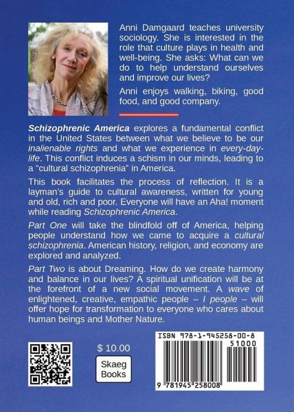 Schizophrenic America explores a fundamental conflict in the United States between what we believe to be our inalienable rights and what we experience in every-day-life. This conflict induces a schism in our minds, leading to a "cultural schizophrenia" in America. This book facilitates the process of reflection. It is a layman’s guide to cultural awareness, written for young and old, rich and poor. Everyone will have an Aha! moment while reading Schizophrenic America. Part One will take the blindfold off of America, helping people understand how we came to acquire a cultural schizophrenia. American history, religion, and economy are explored and analyzed. Part Two is about Dreaming. How do we create harmony and balance in our lives? A spiritual unification will be at the forefront of a new social movement. A wave of enlightened, creative, empathic people – I people – will offer hope for transformation to everyone who cares about human beings and Mother Nature.
