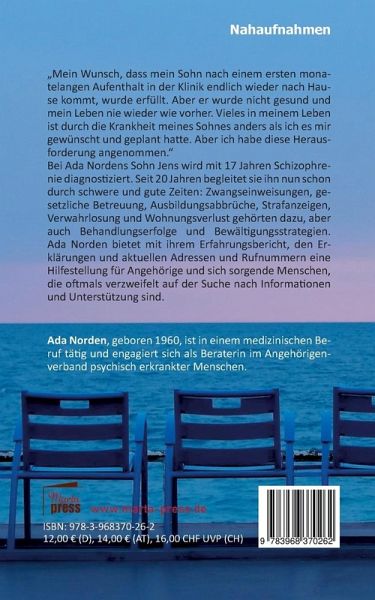 "Mein Wunsch, dass mein Sohn nach einem ersten monatelangen Aufenthalt in der Klinik endlich wieder nach Hause kommt, wurde erfüllt. Aber er wurde nicht gesund und mein Leben nie wieder wie vorher. Vieles in meinem Leben ist durch die Krankheit meines Sohnes anders als ich es mir gewünscht und geplant hatte. Aber ich habe diese Herausforderung angenommen."Bei Ada Nordens Sohn Jens wird mit 17 Jahren Schizophrenie diagnostiziert. Seit 20 Jahren begleitet sie ihn nun schon durch schwere und gute Zeiten: Zwangseinweisungen, gesetzliche Betreuung, Ausbildungsabbrüche, Strafanzeigen, Verwahrlosung und Wohnungsverlust gehörten dazu, aber auch Behandlungserfolge und Bewältigungsstrategien. Ada Norden bietet mit ihrem Erfahrungsbericht, den Erklärungen und aktuellen Adressen und Rufnummern eine Hilfestellung für Angehörige und sich sorgende Menschen, die oftmals verzweifelt auf der Suche nach Informationen und Unterstützung sind.