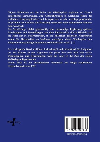 Der vorliegende Band schildert eindrucksvoll und mitreißend die Ereignisse um die Kämpfe in den Argonnen der Jahre 1914 und 1915. Mit vielen Detailangaben und Illustrationen wird der Leser in die Zeit des ersten Weltkriegs mitgenommen.
