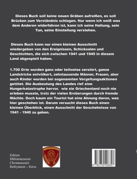 Dieses Buch soll keine neuen Gräben aufreißen,es soll Brücken zum Verständnis schlagen.Nur wenn ich weis was dem Anderen widerfahren ist,kann ich seine Haltung, sein Tun, seine Einstellung verstehen.Dieses Buch kann nur einen kleinen Ausschnitt wiedergeben von den Ereignissen, Schicksalen und Geschichten, die sich zwischen 1941 und 1945 in diesem Land abgespielt haben.1.700 Orte wurden ganz oder teilweise zerstört, ganze Landstriche entvölkert, zehntausende Männer, Frauen, aber auch Kinder wurden bei sogenannten Vergeltungsaktionen getötet. Die Ausbeutung des Landes rief eine Hungerkatastrophe wie sie Griechenland noch nie erleben musste, trotz der vielen Eroberungen durch fremde Mächte.Doch kaum ein Tourist hat eine Ahnung davon was hier geschehen ist. Darum versucht dieses Buch einen kleinen Überblick, einen Ausschnitt der Geschehnisse von 1941 - 1945 zu geben.