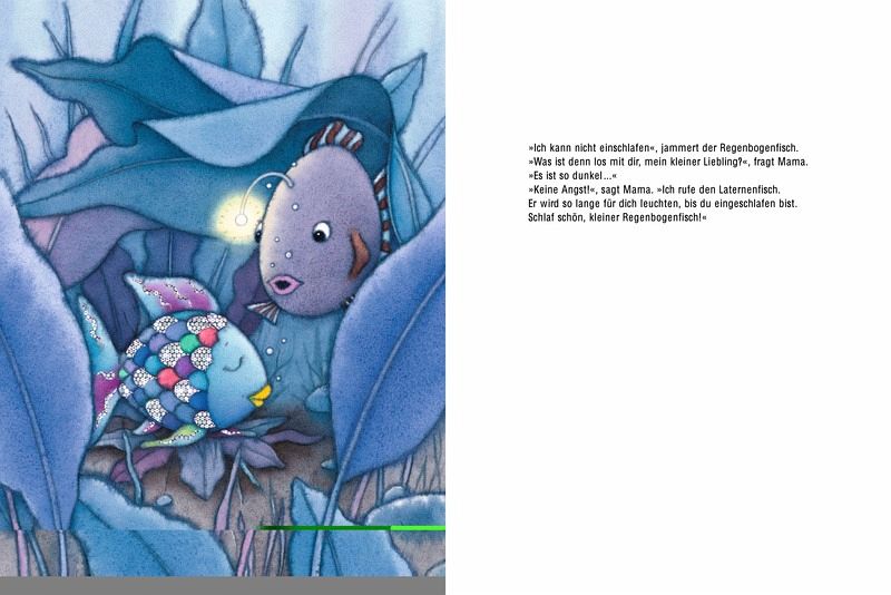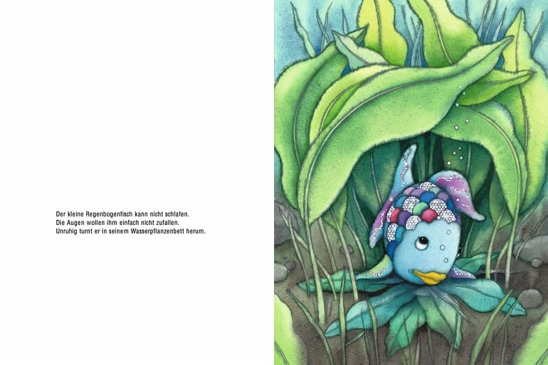 Der kleine Regenbogenfisch kann heute einfach nicht einschlafen, weil er sich fürchtet. Nun hilft nur noch eins: Mama! Liebevoll verspricht sie dem Kleinen, immer auf ihn aufzupassen - ganz egal, ob er sich in der Tintenwolke des Oktopus verirrt oder einen schlimmen Traum hat. Pst! Da schlummert der Regenbogenfisch schon friedlich ein ...