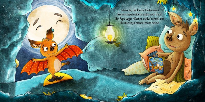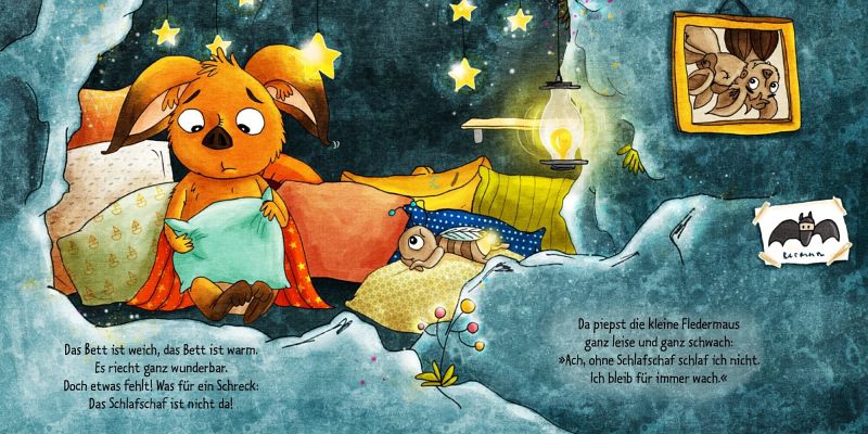 Wie Fledermäuse schlafen gehen: Die kleine Fledermaus ist zwar schon ganz müde, aber einschlafen kann sie nicht. Der Grund: Ihr Schlafschaf ist nicht da. Und ohne das geht es nun mal nicht. Mama und Papa suchen gemeinsam mit ihr überall. Am Ende findet sich das Schlafschaf doch noch an. Es hatte sich am Fenster versteckt. Nun können alle endlich glücklich schlafen. Das hilft nicht nur kleinen Fledermäusen beim Einschlafen: Ein Buch zum Liebhaben, mit eingängigen neuen Reimen von Susanne Lütje und knuffligen Bildern von Stefanie Reich.