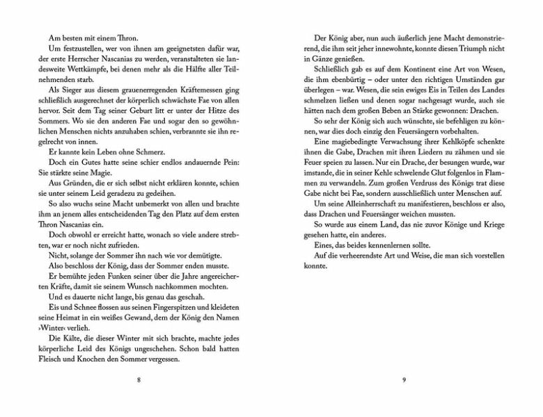 Am Hof des Winterkönigs ist Gylda Endurian eine Gefangene, denn sie trägt eine seltene und verbotene Gabe in sich: Mit ihrem Gesang kann sie das Feuer von Drachen kontrollieren. Nacht für Nacht ist es ihre Aufgabe, den Fae-Adel mit ihren Künsten zu amüsieren - bis der Winterkönig sie auf einem Maskenball unter seinen Gästen versteigern lässt. Ausgerechnet der grausamste von ihnen erhält den Zuschlag: Lord Neven mit dem schiefen Lächeln, der scharfen Zunge und den grünen Augen, die bis in Gyldas Innerstes zu blicken scheinen. Noch ahnt sie nicht, dass Neven ihre Gabe für einen ganz bestimmten Zweck braucht und dass sie in größter Gefahr ist, nicht nur ihr Leben, sondern auch ihr Herz zu verlieren...