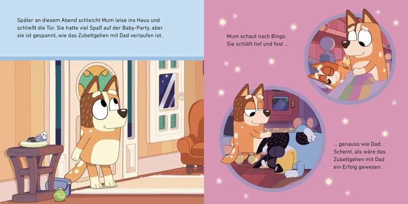 Da Mum zu einer Baby-Party eingeladen ist, muss sich Dad allein um Bluey und Bingo kümmern. Doch Bluey vermisst ihre Mum schrecklich. Keine Geschichte und kein Spiel kann sie ablenken. Wie soll sie nur den Tag überstehen? Und wie soll sie am Abend ohne Mums Gutenachtkuss einschlafen? Doch dann hat Bluey eine Idee: Sie spielt, dass sie eine Mum ist, die zu einer Baby-Party geht ...