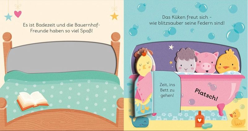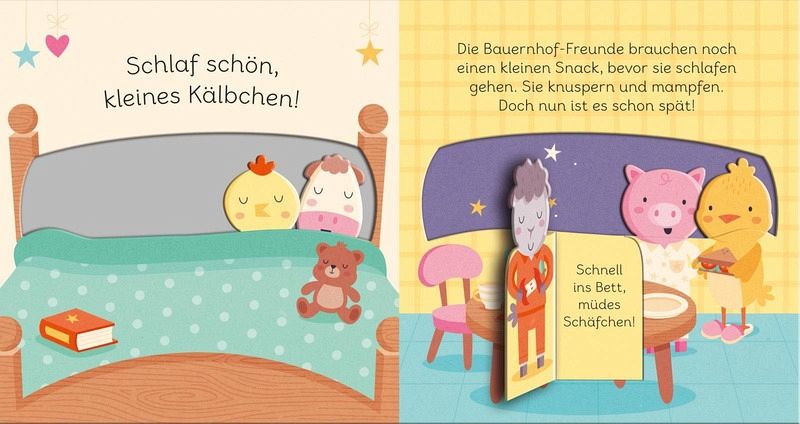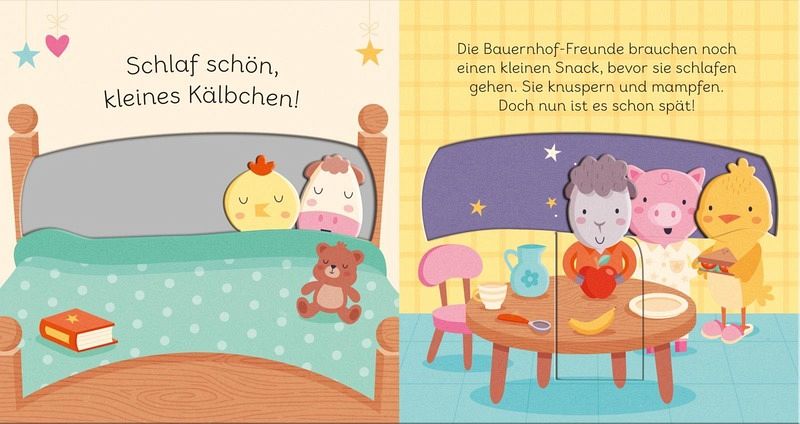 Der kurze, begleitende Text stimmt auf die ruhige Zeit des Tages ein und bereitet optimal auf das Einschlafen und das Land der Träume vor. So können sich die Kleinsten schließlich stolz und glücklich in die Federn kuscheln: Heute haben sie die Tiere ins Bett gebracht!