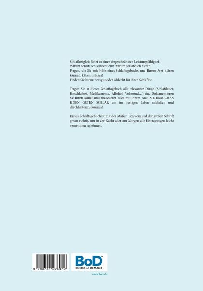 Schlaflosigkeit führt zu einer eingeschränkten Leistungsfähigkeit. Warum schlafe ich schlecht ein? Warum schlafe ich nicht? Fragen, die Sie mit Hilfe eines Schlaftagebuchs und Ihrem Arzt klären können, klären müssen! Finden Sie heraus was gut oder schlecht für Ihren Schlaf ist. Tragen Sie in dieses Schlaftagebuch alle relevanten Dinge (Schlafdauer, Einschlafzeit, Medikamente, Alkohol, Vollmond...) ein. Dokumentieren Sie Ihren Schlaf und analysieren alles mit Ihrem Arzt. SIE BRAUCHEN EINEN GUTEN SCHLAF, um im heutigen Leben mithalten und durchhalten zu können!Dieses Schlaftagebuch ist mit den Maßen 19x27cm und der großen Schrift genau richtig, um in der Nacht oder am Morgen alle Eintragungen leicht vornehmen zu können.