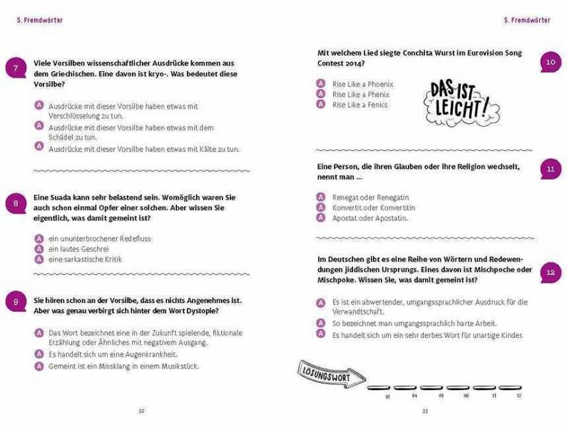 Wer bei den gestellten Fragen gleich im Lösungsteil am Ende des Buches nachschlägt, erweitert zwar auch sein/ihr Wissen. Aber er/sie bringt sich um den ganzen Spaß, den dieses Taschenbuch macht.