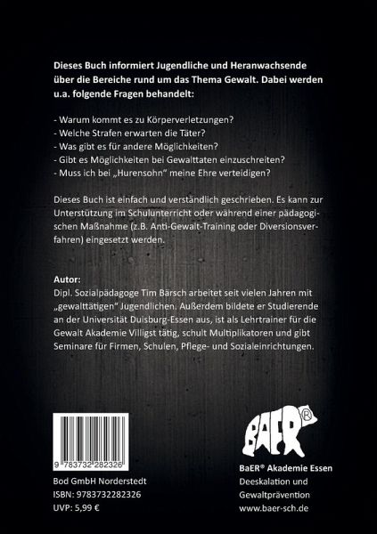 Dieses Buch informiert junge Menschen über die Bereiche rund um das Thema Gewalt. Dabei werden u.a. folgende Fragen behandelt:- Warum kommt es zu Körperverletzungen?- Welche Strafen erwarten die Täter?- Was gibt es für andere Möglichkeiten?- Gibt es Möglichkeiten, bei Gewalttaten einzuschreiten?- Muss ich bei "Hurensohn" meine Ehre verteidigen?Dieses Buch ist einfach und verständlich geschrieben. Es kann zur Unterstützung im Schulunterricht oder während einer pädagogischen Maßnahme (z.B. Anti-Gewalt-Training oder Diversionsverfahren) eingesetzt werden.