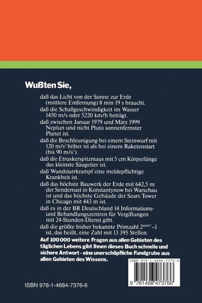 Zahl, Raum, Zeit und Einheiten.- Zahlen und ihre Darstellung Dezimalzahlen.- Dualzahlen.- Römische Zahlen.- Teilbarkeit der Zahlen.- Bruchrechnung.- Zinseszins- und Rentenrechnung.- Potenzrechnung.- Wurzelrechnung.- Logarithmen.- Taschenrechner.- Mengenlehre.- Wichtige mathematische Zeichen.- Geometrie.- Geometrie der Ebene (Planimetrie).- Geometrische Grundkonstruktionen.- Dreiecke.- Vierecke.- Der Kreis.- Die Kegelschnitte.- Umfangs- und Flächenberechnung.- Lehrsätze.- Geometrie des Raumes (Stereometrie).- Trigonometrie Zeit Einheiten und Größen.- Trigonometrie.- Graphische Darstellung der trigonometrischen Funktionen.- Zeitspannen.- Weltzeituhr.- Kalender.- Meßwesen.- Gesetzliche Einheiten.- Sonstige wichtige Einheiten.- Physik.- Allgemeiner Überblick.- Aufgaben der Physik.- Gliederung der Physik.- Physikalische Größen.- Spezielle Zahlenwerte einiger physikalischer Größen.- Mechanik.- Dichte von Körpern.- Mohssche Härteskala.- Oberflächenspannung und dynamische Viskosität.- Reibungszahlen.- Strömungswiderstand.- Akustik.- Grundlagen.- Intervalle.- Reine und temperierte Stimmung.- Schalleistungen.- Lautstärken.- Frequenzen.- Wärmelehre.- Temperaturen.- Wärmeausdehnung.- Spezifische Verbrennungswärme.- Wärmeleitzahlen.- Elektrizität und Magnetismus.- Dielektrizitätszahlen.- Elektrischer Widerstand.- Supraleitung.- Thermoelektrische Spannungsreihe.- Elektrolytische Spannungsreihe.- Permeabilitätszahlen.- Elektrische und elektromagnetische Schwingungen und Wellen.- Atomphysik.- Atome, Ionen und Moleküle.- Elementarteilchen.- Radioaktivität.- Chemie.- Allgemeiner Überblick.- Aufgaben der Chemie.- Gliederung der Chemie.- Zusammensetzung der Stoffe.- Aggregatzustände (Phasen) der Stoffe.- Chemische Elemente.- Das Periodensystem der chemischen Elemente.- Die chemischen Elemente mit den Mischungsverhältnissen ihrer Isotope.- Chemische Verbindungen.- Anorganische Verbindungen.- Organische Verbindungen.- Schmucksteine.- Kunststoffe.- Astronomie.- Allgemeiner Überblick.- Aufgaben der Astronomie.- Erde und Mond.- Das Sonnensystem.- Einführung.- Die Körper des Sonnensystems.- Die Sonne.- Sterne und Weltraum.- Die Sterne.- Die Milchstraße, unser Sternsystem.- Extragalaktische Nebel.- Das Universum.- Biologie.- Allgemeine Biologie Die Pflanze.- Aufbau der Zelle.- Die Zellteilung.- Vererbung.- Die Pflanze.- Einteilung des Pflanzenreichs.- Organe der Pflanzen.- Aufbau und Stoffwechsel.- Alternativer Landbau.- Zimmerpflanzen.- Gewürze und Gewürzkräuter.- Ausländische Früchte.- Naturschutz.- Das Tier.- Einteilung des Tierreichs.- Tierarten.- Physiologische Daten.- Säugetiere.- Vögel.- Aufbau und Zusammensetzung des Tierkörpers.- Haustiere.- Tierschutz.- Der Mensch.- Abstammung.- Anatomie.- Sinnesorgane und Nervensystem.- Hormone des Menschen.- Die Haut.- Schwangerschaft und Geburt.- Stoffwechsel und Ernährung.- Extreme aus dem Tierreich.- Die Erde.- Gestalt und Größe.- Charakteristische Daten.- Pole der Erde.- Horizontale und vertikale Gliederung.- Orte annähernd gleicher geographischer Länge und Breite.- Bevölkerung.- Bevölkerungsentwicklung der Erde.- Trends und Prognosen der Weltbevölkerung.- Millionenstädte der Erde.- Geologischer Aufbau.- Die chemischen Elemente der Erdkruste.- Minerale und Gesteine.- Geothermische Tiefenstufe.- Höhlen der Erde.- Erdgeschichtliche Zeittafel.- Geographische Verbreitung der aktiven Vulkane.- Erdbeben.- Thermen Mitteleuropas.- Naturkatastrophen.- Lufthülle und Klima.- Vertikaler Aufbau der Atmosphäre.- Wolken.- Dämmerungserscheinungen.- Luftdruck.- Klimatische Verhältnisse einiger Großstädte der Welt.- Meteorologische Zeichen.- Die Zeitungswetterkarte.- Regelmäßige, periodische und lokale Winde.- Wetterregeln.- Das Festland.- Mittlere Höhe der Kontinente.- Bedeutende Berge.- Erstbesteigungen.- Depressionen.- Höhenlage ausgewählter Orte.- Waldflächen.- Höhenstufen in den mitteleuropäischen Gebirgen.- Gletscher.- Höhe der klimatischen SchneegrenZahl, Raum, Zeit und Einheiten.- Zahlen und ihre Darstellung Dezimalzahlen.- Geometrie.- Trigonometrie Zeit Einheiten und Größen.- Physik.- Allgemeiner Überblick.- Mechanik.- Akustik.- Temperaturen.- Elektrizität und Magnetismus.- Atomphysik.- Chemie.- Allgemeiner Überblick.- Chemische Elemente.- Chemische Verbindungen.- Astronomie.- Allgemeiner Überblick.- Das Sonnensystem.- Sterne und Weltraum.- Biologie.- Allgemeine Biologie Die Pflanze.- Die Pflanze.- Das Tier.- Der Mensch.- Die Erde.- Gestalt und Größe.- Bevölkerung.- Geologischer Aufbau.- Naturkatastrophen.- Lufthülle und Klima.- Das Festland.- Die Meere.- Entdeckungen und Forschungsreisen.- Geschichte.- Weltgeschichte im Überblick.- Regentenlisten.- Kultur, Philosophie und Religion.- Sprache und Schrift.- Literatur.- Musik.- Bildende Kunst.- Philosophie.- Religion.- Bildung und Wissenschaft.- Ausbildung.- Medien.- Wissenschaft und Forschung.- Nobelpreisträger.- Energie, Umwelt und Technik.- Energie und Umwelt.- Bau- und Haustechnik.- Elektrotechnik.- Daten- und Informationsverarbeitung verarbeitung.- Kraftfahrzeugtechnik.- Schiffbau.- Flugzeugbau.- Raketen- und Raumfahrttechnik.- Technische Erfindungen.- Deutschland.- Fläche und Bevölkerung.- Staatsaufbau der Bundesrepublik Deutschland.- Staatsaufbau der Deutschen Demokratischen Republik.- Politik.- Parteien und Regierungen.- Internationale Organisationen.- Staaten der Erde.- Verkehr.- Tourismus.- Straßenverkehr.- Eisenbahn.- Luftverkehr.- Schiffahrt.- Wirtschaft.- Deutsche Wirtschaft.- Weltwirtschaft.- Sport und Spiele.- Organisation des Sports.- Geräte- und Wettkampfbestimmungen.- Olympische Spiele.- Sportleistungsabzeichen.- Bekannte Gesellschafts- und Unterhaltungsspiele.- Gesundheit.- Erkrankungen.- Vergiftungen.- Heilung und Vorsorge.- Erste Hilfe.- Register.