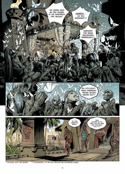 Auf dem Sterbebett teilt der Vertraute des Herrschers seinem Sohn mit, dass dieser sich darauf vorbereiten muss, das ehrenvolle Amt zu übernehmen. Der Sohn jedoch hat bereits eine andere Bürde zu tragen: Er ist auf der Suche nach seiner verschwundenen Tochter Zwei-Blumen. Er vermutet das Schlimmste, denn mittlerweile sind mehr als 40 Mumien in allen Ecken des Königreiches aufgetaucht, und der Mörder dieser Mädchen ist immer noch auf freiem Fuß...Nach dem mittelalterlichen Japan (»Okko«) und den Ländern der Wikinger (»Aslak«) erkundet Hub in diesem vielschichtigen Historienthriller das Aztekenreich.