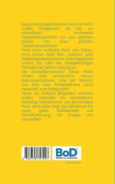 Gesundheitsorganisationen wie die WHO stufen Adipositas als das am schnellsten wachsende Gesundheitsproblem ein und sprechen bereits von einer globalen "Adipositasepidemie."Trotz einer unüberschaubaren Zahl von Diäten, trotz immer mehr fett-, kalorien- oder kohlenhydratreduzierter Nahrungsmittel nimmt die Zahl der übergewichtigen Personen seit Jahren ständig zu.Der Gesundheitsberater Klaus Reder erklärt sehr verständlich, warum kalorienreduzieren, bzw. der Verzicht von Fett oder Kohlehydraten nicht dauerhaft zum Erfolg führt. Wenn Sie wirklich Körperfett verlieren wollen, brauchen Sie enzymreiche, lebendige Lebensmittel und die richtigen Fette, denn darin liegt das Geheimnis für einen guten Stoffwechsel und Fettverbrennung, für Energie und Gesundheit.