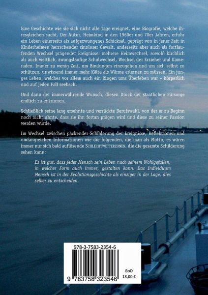 Eine Geschichte wie sie sich nicht alle Tage ereignet, eine Biografie, welche ihresgleichen sucht. Der Autor, Heimkind in den 1960er und 70er Jahren, erfuhr ein Leben einerseits als aufgezwungenes Schicksal, geprägt von in jener Zeit in Kinderheimen herrschender sinnloser Gewalt, anderseits aber auch als fortlaufenden Wechsel prägender Ereignisse: mehrere Heimwechsel, sowohl kirchlich als auch weltlich, zwangsläufige Schulwechsel, Wechsel der Erzieher und Kameraden. Immer zu wenig Zeit, um Bindungen einzugehen und um sich selbst zu schützen, unwissend immer mehr Kälte als Wärme erlernen zu müssen. Ein junges Leben, welches vor allem auch ein Ringen ums Überleben war - körperlich und auf jeden Fall seelisch.Und dann der immerwährende Wunsch, diesen Druck der staatlichen Fürsorge endlich zu entrinnen.Schließlich seine lang ersehnte und verrückte Berufswahl, von der er zu Beginn noch nicht ahnte, dass sie ihn fortan prägen wird und diese zu seiner Passion werden würde.Im Wechsel zwischen packender Schilderung der Ereignisse, Reflektionen und umfangreichen Informationen wie die folgenden, die man als Motto, es wären immer nur sich bald auflösende Schlechtwetterzonen, die die gesamte Schilderung sehen kann:"Es ist gut, dass jeder Mensch sein Leben nach seinem Wohlgefallen, in welcher Form auch immer, gestalten kann. Das Individuum Mensch ist in der Evolutionsgeschichte als einziger in der Lage, dies selber zu entscheiden."