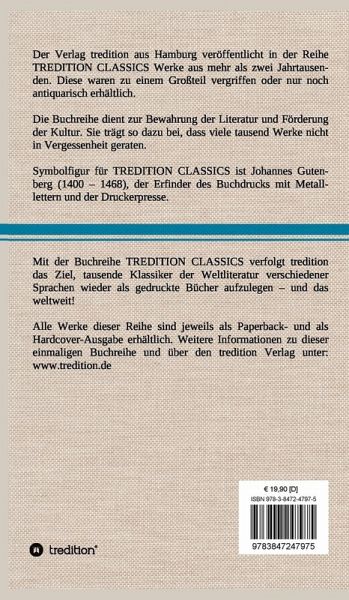 Diese Hardcover-Ausgabe ist Teil der TREDITION CLASSICS. Der Verlag tredition aus Hamburg veröffentlicht in der Buchreihe TREDITION CLASSICS Werke aus mehr als zwei Jahrtausenden. Diese waren zu einem Großteil vergriffen oder nur noch antiquarisch erhältlich. Mit TREDITION CLASSICS verfolgt tredition das Ziel, tausende Klassiker der Weltliteratur verschiedener Sprachen wieder als gedruckte Bücher zu verlegen und das weltweit! Die Buchreihe dient zur Bewahrung der Literatur und Förderung der Kultur. Sie trägt so dazu bei, dass viele tausend Werke nicht in Vergessenheit geraten.