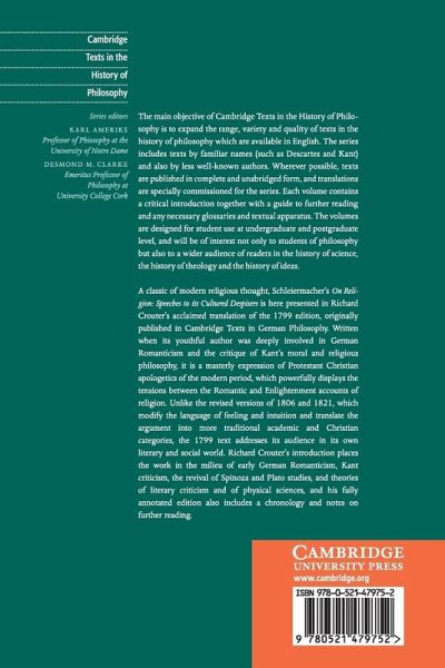 Schleiermacher's On Religion: Speeches to its Cultured Despisers is a classic of modern Protestant religious thought which powerfully displays the tensions between the Romantic and Enlightenment accounts of religion. This fully annotated edition includes a historical introduction, a chronology and notes on further reading.
