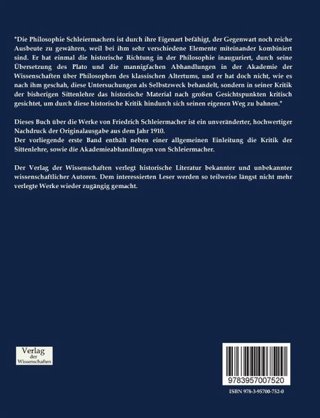Der vorliegende erste Band enthält neben einer allgemeinen Einleitung die Kritik der Sittenlehre, sowie die Akademieabhandlungen von Schleiermacher.