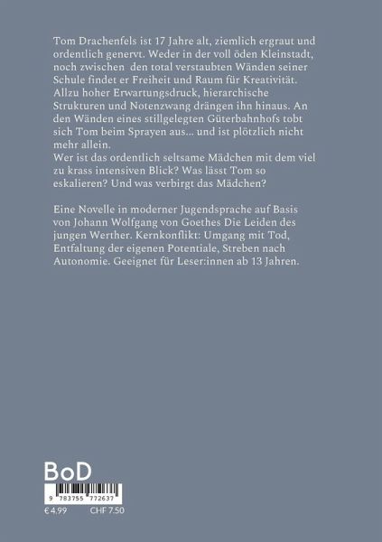 Tom Drachenfels ist 17 Jahre alt, ziemlich ergraut und ordentlich genervt. Weder in der voll öden Kleinstadt, noch zwischen den total verstaubten Wänden seiner Schule findet er Freiheit und Raum für Kreativität. Allzu hoher Erwartungsdruck, hierarchische Strukturen und Notenzwang drängen ihn hinaus. An den Wänden eines stillgelegten Güterbahnhofs tobt sich Tom beim Sprayen aus... und ist plötzlich nicht mehr allein. Wer ist das ordentlich seltsame Mädchen mit dem viel zu krass intensiven Blick? Was lässt Tom so eskalieren? Und was verbirgt das Mädchen?Eine Novelle in moderner Jugendsprache auf Basis von Johann Wolfgang von Goethes Die Leiden des jungen Werther. Kernkonflikt: Umgang mit Tod, Entfaltung der eigenen Potentiale, Streben nach Autonomie. Geeignet für Leser:innen ab 13 Jahren.