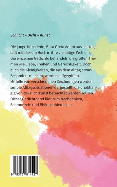 Schlicht - Dicht - KunstDie junge Künstlerin, Elisa Greta Adam aus Leipzig, lädt mit diesem Buch in ihre vielfältige Welt ein. Die einzelnen Gedichte behandeln die großen Themen wie Liebe, Freiheit und Gerechtigkeit. Doch auch die Kleinigkeiten, die aus dem Alltag etwas Besonders machen, werden aufgegriffen. Mithilfe von verschiedenen Zeichnungen werden simple Alltagssituationen dargestellt, die unabhängig von der Dichtkunst betrachtet werden sollten.Dieses Gedichtband lädt zum Nachdenken, Schmunzeln und Philosophieren ein.