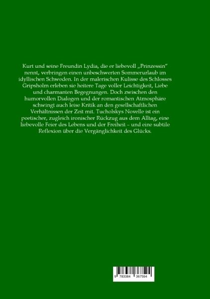 Kurt und seine Freundin Lydia, die er liebevoll "Prinzessin" nennt, verbringen einen unbeschwerten Sommerurlaub im idyllischen Schweden. In der malerischen Kulisse des Schlosses Gripsholm erleben sie heitere Tage voller Leichtigkeit, Liebe und charmanten Begegnungen. Doch zwischen den humorvollen Dialogen und der romantischen Atmosphäre schwingt auch leise Kritik an den gesellschaftlichen Verhältnissen der Zeit mit. Tucholskys Novelle ist ein poetischer, zugleich ironischer Rückzug aus dem Alltag, eine liebevolle Feier des Lebens und der Freiheit - und eine subtile Reflexion über die Vergänglichkeit des Glücks.