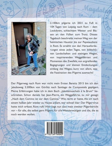 2.100km pilgerte ich 2021 zu Fuß in 104 Tagen von Leipzig nach Rom - dem Lockdown, schlechtem Wetter und Blasen an den Füßen zum Trotz. Dieses Tagebuch beschreibt meinen Weg von der heimischen Haustür bis zur Papstaudienz in Rom. Es erzählt von den Herausforderungen eines jeden Tages, von bildschönen Landschaften und steinigen Wegen, von inspirierenden Weggefährten und Momenten des Zweifels, von ergreifenden Begegnungen und kleinen Entdeckungen entlang des Weges; kurz: von allem, was die Faszination des Pilgerns ausmacht! Der Pilgerweg nach Rom war nicht mein Erster. Bereits 2015 bin ich den Jakobsweg 3.500km von Görlitz nach Santiago de Compostela gepilgert. Meine Erfahrungen habe ich in dem Buch "Jakobsmuscheln à la Bruni" beschrieben. Schon damals hat Jean-Pierre, ein Weggefährte, zu mir gesagt: "Nach dem Camino ist vor dem Camino." Wie recht er hatte. Als ich nach einem halben Jahr wieder zu Hause ankam, war schnell klar: Der Pilgervirus hatte mich erfasst. Rom ruft! Hier liegt nun also mein zweiter Pilgerbericht vor- für alle, die selbst gern Pilgern, für alle Wanderwütigen und die, die es noch werden wollen.