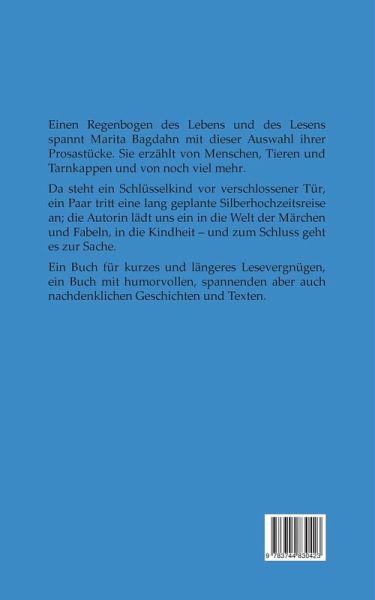 Einen Regenbogen des Lebens und des Lesens spannt Marita Bagdahn mit dieser Auswahl ihrer Prosastücke. Sie erzählt von Menschen, Tieren und Tarnkappen und von noch viel mehr.Da steht ein Schlüsselkind vor verschlossener Tür, ein Paar tritt eine lang geplante Silberhochzeitsreise an; die Autorin lädt uns ein in die Welt der Märchen und Fabeln, in die Kindheit - und zum Schluss geht es zur Sache. Ein Buch für kurzes und längeres Lesevergnügen, ein Buch mit humorvollen, spannenden aber auch nachdenklichen Geschichten und Texten.