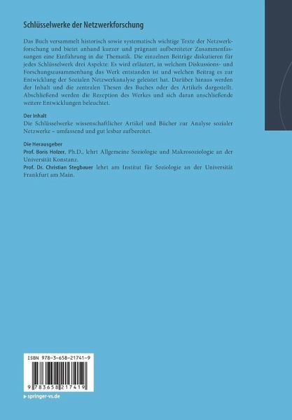 Das Buch versammelt historisch sowie systematisch wichtige Texte der Netzwerkforschung und bietet anhand kurzer und prägnant aufbereiteter Zusammenfassungen eine Einführung in die Thematik. Die einzelnen Beiträge diskutieren für jedes Schlüsselwerk drei Aspekte: Es wird erläutert, in welchem Diskussions- und Forschungszusammenhang das Werk entstanden ist und welchen Beitrag es zur Entwicklung der Sozialen Netzwerkanalyse geleistet hat. Darüber hinaus werden der Inhalt und die zentralen Thesen des Buches oder des Artikels dargestellt. Abschließend werden die Rezeption des Werkes und sich daran anschließende weitere Entwicklungen beleuchtet.
