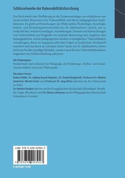 Das Buch bietet eine Einführung in die Zusammenhänge von subjektiven und strukturellen Momenten der Vulnerabilität und ihren pädagogischen Implikationen. Es greift auf Forschungen der Philosophie, Psychologie, Soziologie, Kultur- und Erziehungswissenschaft des 20. Jahrhunderts zurück, um zu verdeutlichen, welche Grundlagen, Auswirkungen, Formen und Entwicklungen von Verletzbarkeit und Fragilität von zentraler Bedeutung sind. Zugleich wird herausgearbeitet, welche pädagogischen Ansätze es ermöglichen, Vulnerabilitäten vorzubeugen, ihnen zu begegnen oder ihre Folgen zu bearbeiten. Strukturell orientiert sich das Buch an zentralen Autor_innen des 20. Jahrhunderts, denen nicht nur für ihre jeweilige Disziplin, sondern auch für den Vulnerabilitätsdiskurs insgesamt eine Schlüsselstellung zukommt.