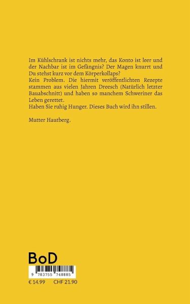 Im Kühlschrank ist nichts mehr, das Konto ist leer und der Nachbar ist im Gefängnis? Der Magen knurrt und Du stehst kurz vor dem Körperkollaps?Kein Problem. Die hiermit veröffentlichten Rezepte stammen aus vielen Jahren Dreesch (Natürlich letzter Bauabschnitt) und haben so manchem Schweriner das Leben gerettet. Haben Sie ruhig Hunger. Dieses Buch wird ihn stillen. Mutter Hautberg.