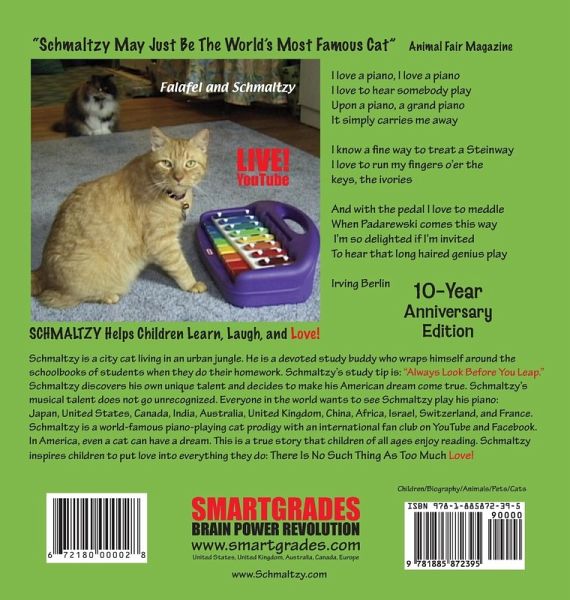 SCHMALTZY: In America Even a Cat Can Have a Dream Ages 7-12 The First Book of Color-Coded Words to Help Children Learn Meet Schmaltzy, the world's most famous pianöplaying cat! From abandoned kitten to celebrated virtuoso, Schmaltzy's true story shows children everywhere that dreams can come true-even for a cat in the big city. This inspiring, educational book blends biography, storytelling, and learning tools to captivate young readers ages 7-12. With color¿coded vocabulary words woven throughout, children expand their language skills while following Schmaltzy's adventures in New York City. Inside You'll Discover:A heartwarming true story of Schmaltzy and his companion Falafel, teaching resilience, friendship, and creativity. Color¿coded vocabulary words that make learning new terms fun, memorable, and easy. Educational enrichment: practice tips, study buddy lessons, and inspirational messages that encourage kids to put love and effort into everything they do. Entertainment & empowerment: a cat who becomes CEO, musician, and international star-proving that every child (and every cat!) can find their unique talent. Winner of the Children's Literature Bookworm Award, SCHMALTZY is more than a story-it's a tool for education, entertainment, enlightenment, and empowerment. Perfect for classrooms, libraries, and family reading time, this collector's edition will inspire children to dream big, learn joyfully, and believe in themselves.