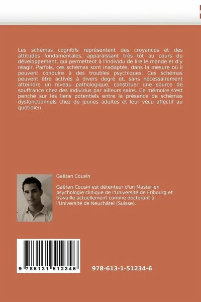 Les schémas cognitifs représentent des croyances et des attitudes fondamentales, apparaissant très tôt au cours du développement, qui permettent à l'individu de lire le monde et d'y réagir. Parfois, ces schémas sont inadaptés, dans la mesure où il peuvent conduire à des troubles psychiques. Ces schémas peuvent être activés à divers degré et, sans nécessairement atteindre un niveau pathologique, constituer une source de souffrance chez des individus par ailleurs sains. Ce mémoire s'est penché sur les liens potentiels entre la présence de schémas dysfonctionnels chez de jeunes adultes et leur vécu affectif au quotidien.