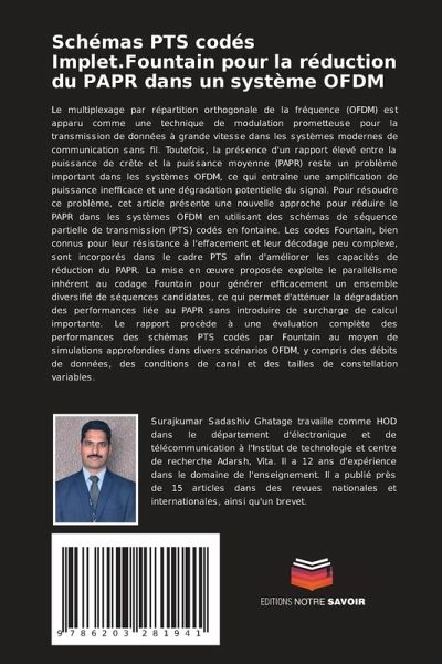 Le multiplexage par répartition orthogonale de la fréquence (OFDM) est apparu comme une technique de modulation prometteuse pour la transmission de données à grande vitesse dans les systèmes modernes de communication sans fil. Toutefois, la présence d'un rapport élevé entre la puissance de crête et la puissance moyenne (PAPR) reste un problème important dans les systèmes OFDM, ce qui entraîne une amplification de puissance inefficace et une dégradation potentielle du signal. Pour résoudre ce problème, cet article présente une nouvelle approche pour réduire le PAPR dans les systèmes OFDM en utilisant des schémas de séquence partielle de transmission (PTS) codés en fontaine. Les codes Fountain, bien connus pour leur résistance à l'effacement et leur décodage peu complexe, sont incorporés dans le cadre PTS afin d'améliorer les capacités de réduction du PAPR. La mise en oeuvre proposée exploite le parallélisme inhérent au codage Fountain pour générer efficacement un ensemble diversifié de séquences candidates, ce qui permet d'atténuer la dégradation des performances liée au PAPR sans introduire de surcharge de calcul importante. Le rapport procède à une évaluation complète des performances des schémas PTS codés par Fountain au moyen de simulations approfondies dans divers scénarios OFDM, y compris des débits de données, des conditions de canal et des tailles de constellation variables.
