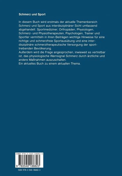 Sportliche Höchstleistungen werden heute oft nur noch unter Schmerzen erbracht und viele Sporttreibende leiden unter schmerzhaften Bewegungs- und Leistungseinschränkungen. Der mit großen Schmerzen verbundene Tod einer begabten Hochleistungssportlerin ging in jüngster Vergangenheit durch alle Medien. In diesem Buch wird erstmals der aktuelle Themenbereich Schmerz und Sport aus interdisziplinärer Sicht umfassend abgehandelt. Sportmediziner, Orthopäden, Physiologen, Schmerz- und Physiotherapeuten, Psychologen, Trainer und Sportler vermitteln in ihren Beiträgen wichtige Hinweise für eine richtige und schmerzfreie Sportausübung und eine interdisziplinäre schmerztherapeutische Versorgung der sporttreibenden Bevölkerung. Außerdem wird die Frage angesprochen, inwieweit es vertretbar ist, das physiologische Warnsignal Schmerz durch ärztliche und andere Maßnahmen auszuschalten. Ein aktuelles Buch zu einem aktuellen Thema.