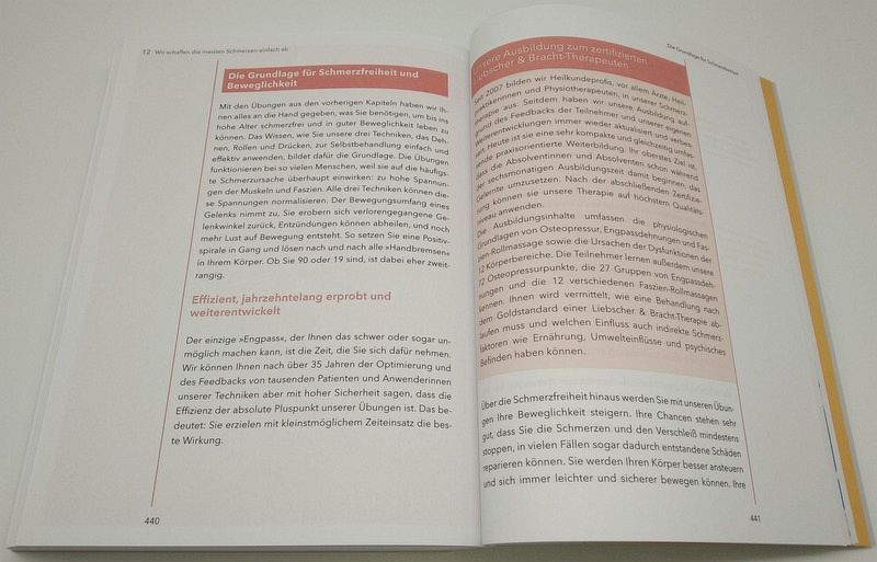 Die Inhalte der Kapitel der einzelnen Schmerzzonen beinhalten viele Wiederholungen; ich habe das Buch allerdings komplett von vorne bis hinten durchgelesen. Wahrscheinlich fällt es gar nicht auf, wenn man nur das Kapitel zu seinem Schmerzbereich durchliest und bei den anderen nur die kurze in einem blauen Kästchen enthaltene Zusammenfassung. Eigentlich hätte mir die Grundeinführung ausgereicht; die vielen Wiederholungen waren mir zuviel. Das Prinzip der vorgestellten Übungen beinhaltet das Dehnen um den Bewegungsumfang der Gelenke zu erhöhen, das Rollen mit Faszienrolle oder Ball sowie das Drücken bestimmter Schmerzpunkte. Bei den meisten wird das schon Linderung bringen, wenn nicht, werden drei Sitzungen bei zertifizierten Therapeuten empfohlen um die Wirksamkeit auszuschließen und traditionelle medizinische Behandlungen zu wählen.