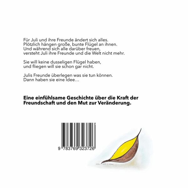 Für Juli und ihre Freunde ändert sich alles. Plötzlich hängen große, bunte Flügel an ihnen. Und während sich alle darüber freuen, versteht Juli ihre Freunde und die Welt nicht mehr. Sie will keine dusseligen Flügel haben, und fliegen will sie schon gar nicht. Julis Freunde überlegen was sie tun können. Dann haben sie eine Idee... Eine einfühlsame Geschichte über die Kraft der Freundschaft und den Mut zur Veränderung. Birte Förster Kunst und Seiten