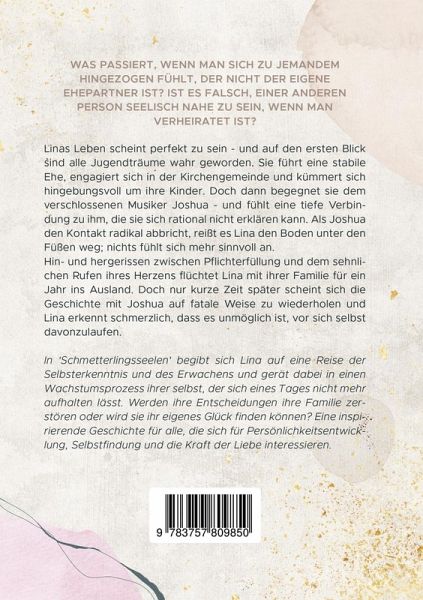 Was passiert, wenn man sich zu jemandem hingezogen fühlt, der nicht der eigene Ehepartner ist? Ist es falsch, einer anderen Person seelisch nahe zu sein, wenn man verheiratet ist? Linas Leben scheint perfekt zu sein - und auf den ersten Blick sind alle Jugendträume wahr geworden. Sie führt eine stabile Ehe, engagiert sich in der Kirchengemeinde und kümmert sich hingebungsvoll um ihre Kinder. Doch dann begegnet sie dem verschlossenen Musiker Joshua - und fühlt eine tiefe Verbindung zu ihm, die sie sich rational nicht erklären kann. Als Joshua den Kontakt radikal abbricht, reißt es Lina den Boden unter den Füßen weg; nichts fühlt sich mehr sinnvoll an. Hin- und hergerissen zwischen Pflichterfüllung und dem sehnlichen Rufen ihres Herzens flüchtet Lina mit ihrer Familie für ein Jahr ins Ausland. Doch nur kurze Zeit später scheint sich die Geschichte mit Joshua auf fatale Weise zu wiederholen und Lina erkennt schmerzlich, dass es unmöglich ist, vor sich selbst davonzulaufen.In 'Schmetterlingsseelen' begibt sich Lina auf eine Reise der Selbsterkenntnis und des Erwachens und gerät dabei in einen Wachstumsprozess ihrer selbst, der sich eines Tages nicht mehr aufhalten lässt. Werden ihre Entscheidungen ihre Familie zerstören oder wird sie ihr eigenes Glück finden können? Eine inspirierende Geschichte für alle, die sich für Persönlichkeitsentwicklung, Selbstfindung und die Kraft der Liebe interessieren.