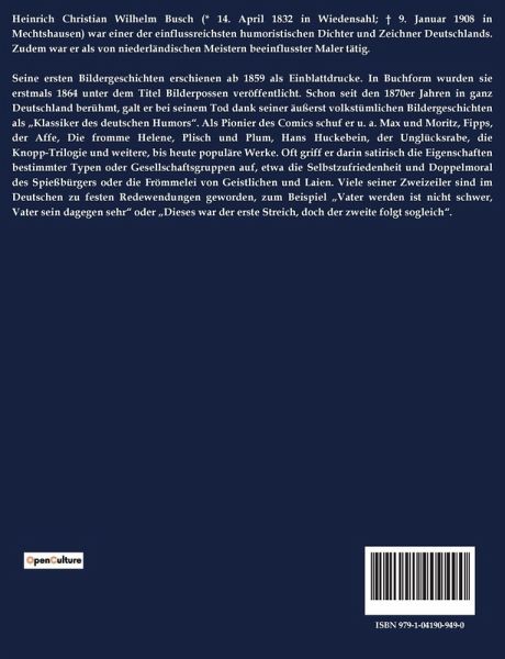 Heinrich Christian Wilhelm Busch (* 14. April 1832 in Wiedensahl; ¿ 9. Januar 1908 in Mechtshausen) war einer der einflussreichsten humoristischen Dichter und Zeichner Deutschlands. Zudem war er als von niederländischen Meistern beeinflusster Maler tätig. Seine ersten Bildergeschichten erschienen ab 1859 als Einblattdrucke. In Buchform wurden sie erstmals 1864 unter dem Titel Bilderpossen veröffentlicht. Schon seit den 1870er Jahren in ganz Deutschland berühmt, galt er bei seinem Tod dank seiner äußerst volkstümlichen Bildergeschichten als ¿Klassiker des deutschen Humors¿. Als Pionier des Comics schuf er u. a. Max und Moritz, Fipps, der Affe, Die fromme Helene, Plisch und Plum, Hans Huckebein, der Unglücksrabe, die Knopp-Trilogie und weitere, bis heute populäre Werke. Oft griff er darin satirisch die Eigenschaften bestimmter Typen oder Gesellschaftsgruppen auf, etwa die Selbstzufriedenheit und Doppelmoral des Spießbürgers oder die Frömmelei von Geistlichen und Laien. Viele seiner Zweizeiler sind im Deutschen zu festen Redewendungen geworden, zum Beispiel ¿Vater werden ist nicht schwer, Vater sein dagegen sehr¿ oder ¿Dieses war der erste Streich, doch der zweite folgt sogleich¿.