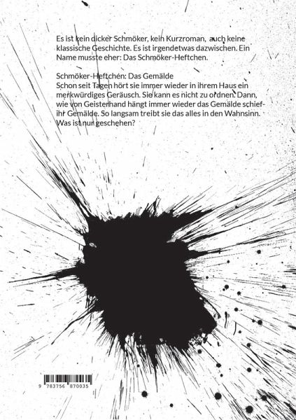 Es ist kein dicker Schmöker, kein Kurzroman, aber auch keine klassische Geschichte. Es ist irgendetwas dazwischen. Ein Name musste eher: Das Schmöker-Heftchen.Schmöker-Heftchen: Das GemäldeSchon seit Tagen hört sie immer wieder in ihrem Haus ein merkwürdiges Geräusch. Sie kann es nicht zu ordnen. Dann, wie aus Zauberhand hängt immer wieder das Gemälde schief- ihr Gemälde. So langsam treibt sie das alles in den Wahnsinn. Was ist nur geschehen?