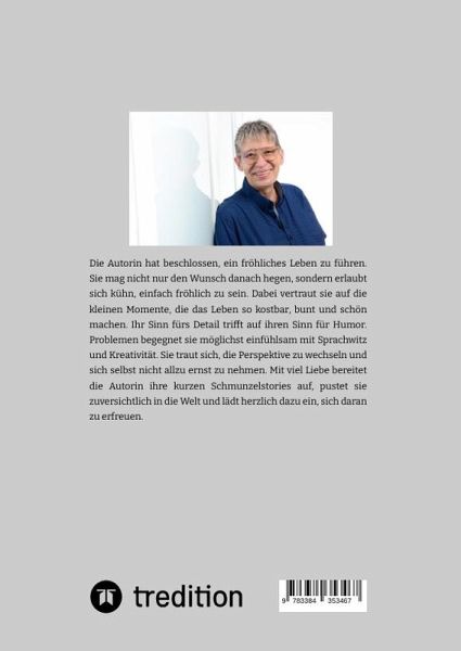 Die Autorin hat beschlossen, ein fröhliches Leben zu führen. Sie mag nicht nur den Wunsch danach hegen, sondern erlaubt sich kühn, einfach fröhlich zu sein. Dabei vertraut sie auf die kleinen Momente, die das Leben so kostbar, bunt und schön machen. Ihr Sinn fürs Detail trifft auf ihren Sinn für Humor. Problemen begegnet sie möglichst einfühlsam mit Sprachwitz und Kreativität. Sie traut sich, die Perspektive zu wechseln und sich selbst nicht allzu ernst zu nehmen. Mit viel Liebe bereitet die Autorin ihre kurzen Schmunzelstories auf, pustet sie zuversichtlich in die Welt und lädt herzlich dazu ein, sich daran zu erfreuen.