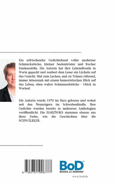 Ein erfrischender Gedichteband voller moderner Schmuckstücke, kleiner Seelentröster und frecher Denkanstöße. Die Autorin hat ihre Lebensfreude in Worte gepackt und zaubert dem Leser ein Lächeln auf das Gesicht. Mal zum Lachen, mal zu Tränen rührend, immer lebensnah mit einem humoristischen Blick auf das Leben, eben wahre Schmunzelstücke. Glück in Worten.
