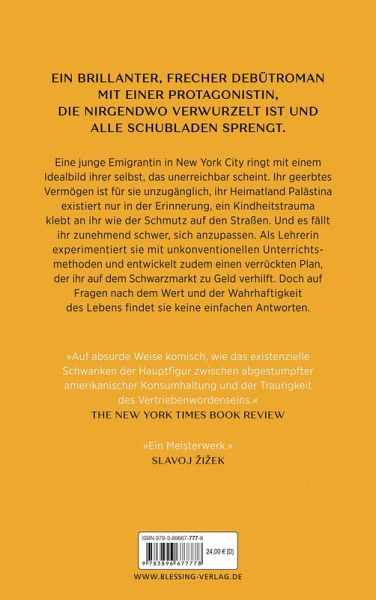 Eine junge Emigrantin in New York City ringt mit einem Idealbild ihrer selbst, das unerreichbar scheint. Ihr geerbtes Vermögen ist für sie unzugänglich, ihr Heimatland Palästina existiert nur in der Erinnerung, ein Kindheitstrauma verfolgt sie hartnäckig. Und es fällt ihr zunehmend schwer, sich anzupassen. Als Lehrerin experimentiert sie mit unkonventionellen Unterrichtsmethoden und entwickelt zudem einen verrückten Plan, der ihr auf dem Schwarzmarkt zu Geld verhilft. Doch auf Fragen nach Wert und der Wahrhaftigkeit des Lebens findet sie keine einfachen Antworten. Durch obsessives Reinigen ihres Körpers mit teuren Produkten versucht sie, Kontrolle über ihr Leben zu erlangen.