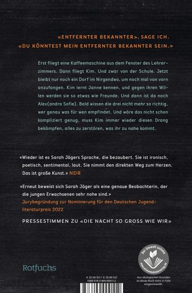 Sarah Jäger hat eine ganz besondere Art, von Jugendlichen zu erzählen und ihre Perspektiven einzunehmen. Eine auffällige, aber nicht zu gewollte Ausdrucksweise macht auch ihren neuen Roman wieder poetisch, aber gleichzeitig so realistisch und nahbar. Gerne hätte ich mehr von den beiden (oder den dreien) gelesen, da ich das Ende allerdings besonders gelungen fand, verzeih ich dem Roman, dass es eins hat.