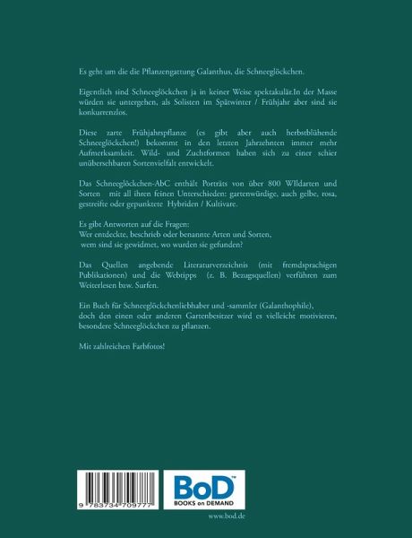 Es geht um die die Pflanzengattung Galanthus, die Schneeglöckchen.Eigentlich sind Schneeglöckchen ja in keiner Weise spektakulär.In der Masse würden sie untergehen, als Solisten im Spätwinter / Frühjahr aber sind sie konkurrenzlos.Diese zarte Frühjahrspflanze (es gibt aber auch herbstblühende Schneeglöckchen!)bekommt in den letzten Jahrzehnten immer mehr Aufmerksamkeit.Wild- und Zuchtformen haben sich zu einer schier unübersehbaren Sortenvielfalt entwickelt.Das Schneeglöckchen-ABC enthält Porträts von über 800 Wildarten und Sorten - mit all ihren feinen Unterschieden: gartenwürdige, auch gelbe, rosa, gestreifte oder gepunktete Hybriden / Kultivare.Es gibt Antworten auf die Fragen:Wer entdeckte, beschrieb oder benannte Arten und Sorten, wem sind sie gewidmet, wo wurden sie gefunden?Das Quellen angebende Literaturverzeichnis (mit fremdsprachigen Publikationen) und die Webtipps (z. B. Bezugsquellen) verführen zum Weiterlesen bzw. Surfen.Ein Buch für Schneeglöckchenliebhaber und -sammler (Galanthophile), doch den einen oder anderen Gartenbesitzer wird es darüber hinaus motivieren, selbst Schneeglöckchen zu pflanzen.Mit zahlreichen Farbfotos!