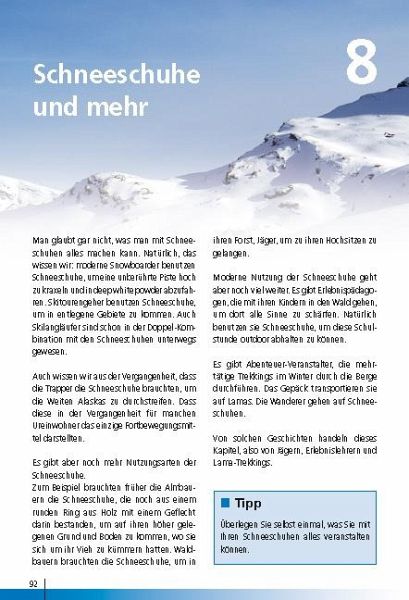 1 Die Leichtigkeit des Schneeschuh-Wanderns"Einfach cool"2 Die ersten SchritteWinter-Wandern auf großem Fuße3 HistorieDer Schneeschuhgeher - einst und heute3.1. Leben mit Schneeschuhen: Ein Jahr mit Jürgen am YukonMaterialbruch - 20 Meilen von der Hütte entfernt4 Ausrüstung4.1. Die verschiedenen SchneeschuhmodelleVom Trapper-Schuh bis zum High Tech-Modell4.1.1 Schneeschuhe aus HolzDie Originale sind nur noch bloße Dekoration4.1.2 Schneeschuhe aus Aluminium"Snowboard mit Bremse"4.1.3. Schneeschuhe aus KunststoffPatentiertes, dreidimensionales Flügelkonzept4.1.4. Verschiedene Schneeschuh-FormenLaufen, wie der Mensch geht4.2. Alles über Bindungen, Steighilfen und HarscheisenOptimaler Abrollpunkt4.3 Die StöckeUnterschätzte Alleskönner4.4. Die Bergschuhe und die KleidungFunktion ist alles4.5 Dieses Zubehör benötigt der SchneeschuhwandererRichtige Entscheidung zum richtigen Zeitpunkt4.6 Die KostenIm Set billiger5 Techniken5.1. Kleine BodenkundeWie die Südseite so nicht die Nordseite5.2. Gehen will gelernt seinVom Abrollen über den Mittelfuß5.3. Das Bergauf-GehenDie Zehn-Uhr-Stellung5.4. Das Bergab-GehenEs ist immer noch zehn Uhr5.5. Das Laufen in SpitzkehrenWendepunkte der Tour5.6. Das Laufen im TiefschneeEinzelgänger haben es schwerer5.7. Das RückwärtslaufenStolpern im hochalpinen Bereich6 Gesundheit und Training6.1. Das Therapeutisches Bewegungszentrum in Isny-Neutrauchburg"Ich kann das ja noch"6.2. Das Training mit dem Personal Coach"Mein Stadion ist die Natur"6.3. Das Rennen am Hochhäderich"Respektiere Deine Grenzen"7 Tourenplanung7.1. Wo kann ich gehen?Wege auf die Almen7.2. Wo darf ich gehen?"Problemsportart Schneeschuhwandern"7.3. Planung für SchneeschuhtourenDie Checkliste7.4. Orientierung und WegfindungDer eigenen Spur folgen7.5. Die RoutenmarkierungWelche Strecke ist für mich geeignet?7.6 Die weiße Gefahr - LawinenSchussfahrt auf dem Schneebrett7.7 Schneeschuhtour mit ÜberlebenstrainingDie Nacht im Iglu8 Schneeschuhe und mehr8.1. Josef Besler - Der Jäger aus ObermaiselsteinDas Original8.2. Erlebnispädagogik: Die Silbertaler Waldschule"Wo bitte schön sind denn hier die Elefanten?"8.3. Trekking mit LamasBill, Amadeus, Gregor, Bert und Short of Can9 Leichte Touren9.1. Tour 1: Der Feldberg im SchwarzwaldPanorama-Blick auf die JungfrauTour-Infos9.2 Tour 2: Maierhöfen bei Isny im AllgäuFauna und Flora auf der GschwendwaldtourTour-Infos9.3 Tour 3: Bad Hindelang-Oberjoch/Auf den JochschrofenZickzack zum GipfelTour-Infos9.4 Tour 4: Im Montafon(Österreich)/Auf die Bieler HöheEine Holländerin im Schnee: "Wie im Märchen"Tour-Infos9. Tour : Toggenburg (Schweiz)/Am Fuße des SchafbergsFamilientour für GenießerTour-Infos10 Mittelschwere Touren10.1. Tour 1: In den Ammergauer Alpen/ Auf den Notkar"Er fiel nicht tiefer als in Gottes Hand"Tour-Infos10.2 Tour 2: Maierhöfen bei Isny im AllgäuStetige Steigerung auf der KugeltourTour-Infos10.3 Tour 3: Bad Hindelang/Auf das Wertacher Hörnle"Fataler Unverwundbarkeitsglaube"Tour-Infos10.4 Tour 4: Im Montafon in der Silvretta Nova/ÖsterreichSchlafes BruderTour-Infos10. Tour : Toggenburg (Schweiz)/Auf die GössigenhöchiVom Exoten zum TrendTour-Infos11 Schwere Touren11.1. Tour: Tschagguns im Montafon (Österreich)/Auf die MittagsspitzeDeutsche wollen eigenen GrabserTour-Infos12 Alpine Touren12.1. Tour: Mehrtagestour in den Trentiner Dolomiten (Italien)Auf 2.800 Metern Höhe mit SchneeschuhenTour-Infos13 Anhang13.1. Autor und ExpertenFrank SimoneitOliver HähnelFranz Ressmann13.2. Fotonachweis13.3. Quellennachweis13.4. Links