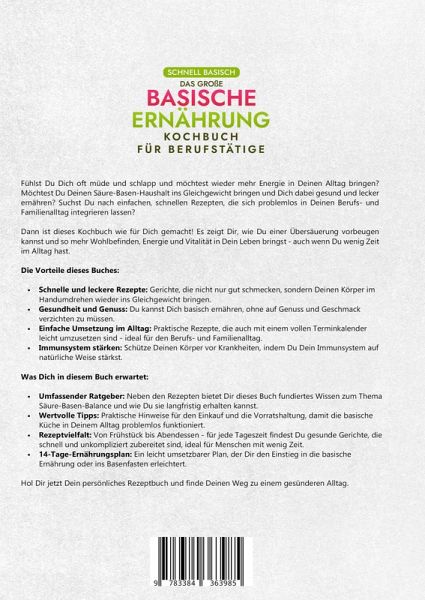 Fühlst Du Dich oft müde und schlapp und möchtest wieder mehr Energie in Deinen Alltag bringen? Möchtest Du Deinen Säure-Basen-Haushalt ins Gleichgewicht bringen und Dich dabei gesund und lecker ernähren? Suchst Du nach einfachen, schnellen Rezepten, die sich problemlos in Deinen Berufs- und Familienalltag integrieren lassen?Dann ist dieses Kochbuch wie für Dich gemacht! Es zeigt Dir, wie Du einer Übersäuerung vorbeugen kannst und so mehr Wohlbefinden, Energie und Vitalität in Dein Leben bringst - auch wenn Du wenig Zeit im Alltag hast.Die Vorteile dieses Buches:- Schnelle und leckere Rezepte: Gerichte, die nicht nur gut schmecken, sondern Deinen Körper im Handumdrehen wieder ins Gleichgewicht bringen.- Gesundheit und Genuss: Du kannst Dich basisch ernähren, ohne auf Genuss und Geschmack verzichten zu müssen.- Einfache Umsetzung im Alltag: Praktische Rezepte, die auch mit einem vollen Terminkalender leicht umzusetzen sind - ideal für den Berufs- und Familienalltag.- Immunsystem stärken: Schütze Deinen Körper vor Krankheiten, indem Du Dein Immunsystem auf natürliche Weise stärkst.Was Dich in diesem Buch erwartet:- Umfassender Ratgeber: Neben den Rezepten bietet Dir dieses Buch fundiertes Wissen zum Thema Säure-Basen-Balance und wie Du sie langfristig erhalten kannst.- Wertvolle Tipps: Praktische Hinweise für den Einkauf und die Vorratshaltung, damit die basische Küche in Deinem Alltag problemlos funktioniert.- Rezeptvielfalt: Von Frühstück bis Abendessen - für jede Tageszeit findest Du gesunde Gerichte, die schnell und unkompliziert zubereitet sind, ideal für Menschen mit wenig Zeit.- 14-Tage-Ernährungsplan: Ein leicht umsetzbarer Plan, der Dir den Einstieg in die basische Ernährung oder ins Basenfasten erleichtert.Hol Dir jetzt Dein persönliches Rezeptbuch und finde Deinen Weg zu einem gesünderen Alltag.