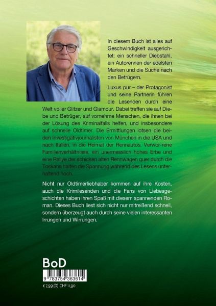 In diesem Buch ist alles auf Geschwindigkeit ausgerichtet: ein schneller Diebstahl, ein Autorennen der edelsten Marken und die Suche nach den Betrügern.Luxus pur - der Protagonist und seine Partnerin führen die Lesenden durch eine Welt voller Glitzer und Glamour. Dabei treffen sie auf Diebe und Betrüger, auf vornehme Menschen, die ihnen bei der Lösung des Kriminalfalls helfen, und insbesondere auf schnelle Oldtimer. Die Ermittlungen lot-sen die beiden Investigativjournalisten von München in die USA und nach Italien, in die Heimat der Rennautos. Verworrene Familienverhältnisse, ein unermesslich hohes Erbe und eine Rallye der schicken alten Rennwagen quer durch die Toskana halten die Spannung während des Lesens un-terhaltend hoch. Nicht nur Oldtimerliebhaber kommen auf ihre Kosten, auch die Krimilesenden und die Fans von Liebesgeschichten haben ihren Spaß mit diesem spannenden Roman. Dieses Buch liest sich nicht nur mitreißend schnell, sondern überzeugt auch durch seine vielen interessanten Irrungen und Wirrungen.