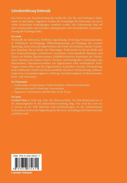Werkstoffe der Elektronik.- Halbleiter.- Eigenleitung.- Dotierung.- Strommechanismen in Halbleitern.- pn-Übergang.- Diffusionsspannung.- pn-Übergang mit externer Spannung.- ideale und reale Eigenschaften der Diode, des Schalters und des Verstärkers.- Kennlinie der pn-Diode mit Näherungen.- Widerstände bei der pn-Diode und ihre Ersatzschaltungen.- nichtlinearer Stromkreis.- unterschiedliche Bauarten und Typen von Dioden.- Bipolartransistor.- Feldeffekttransistor.- Kennlinien der Transistoren.- Transistor als Schalter.- Gleich-, Wechsel- und Mischgrößen.- Schaltungen zum Gleichrichten.- Operationsverstärker mit Eigenschaften und verschiedenen Schaltungen.- Passive Filter und ihre Eigenschaften.- Kaskadierte Systeme.- Wärmeleitung in der Elektronik.- Modell mit Ersatzschaltbild.- Maximale Verlustleistung.- Gehäusetemperatur.- Lastminderungskurve.- Kühlung.- Datenblattangaben von Bauelementen.- Kenn- und Grenzdaten.