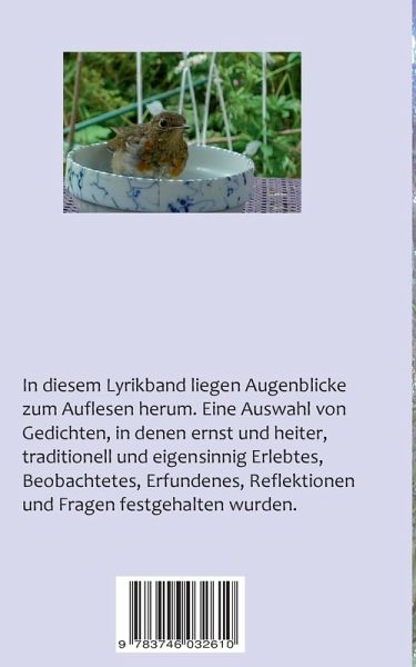In diesem Lyrikband liegen Augenblicke zum Auflesen herum: Eine Auswahl von Gedichten, in denen ernst, heiter, traditionell, unkonventionell und eigenwillig Erlebtes, Gesehenes, Beobachtetes, Erfundenes, Reflektionen und Fragen festgehalten werden.